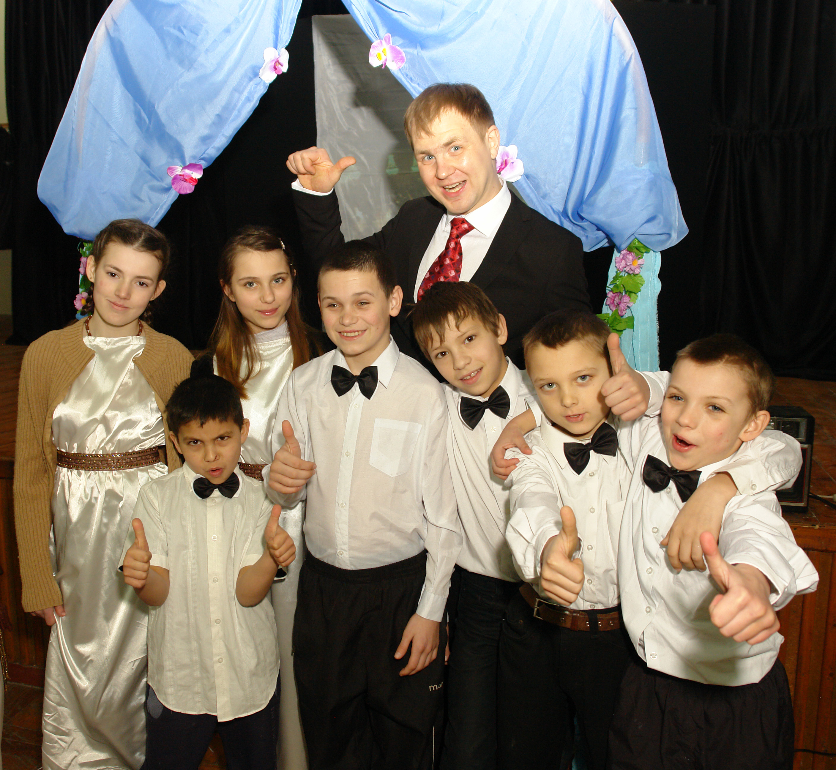 Чтобы ребята с первых минут окунулись в атмосферу детского бала, команда волонтеров привезла белые платья для девочек и белые рубашки с галстуком бабочкой для мальчиков. Дети одевали их с большим удовольствием, преображаясь на глазах в леди и джентльменов.